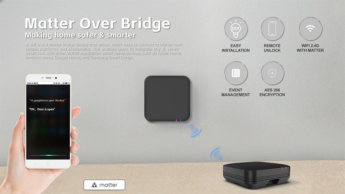 JL-M1 è un dispositivo Matter Bridge che consente a serrature e sensori intelligenti di connettersi a piattaforme ed ecosistemi compatibili con Matter. Ciò consente agli utenti di integrare qualsiasi serratura e sensore della serie JSW con altri dispositivi domestici intelligenti compatibili con Matter, come Apple Home, Amazon Alexa, Google Home e Samsung Smart Things.